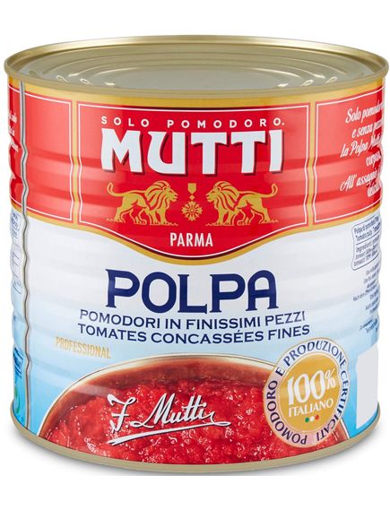 М’якоть томатів Mutti у дуже дрібних шматочках зберігає всю свіжість свіжозібраних помідорів. Це унікальний продукт, оскільки його найбільш м’ясоподібна частина поєднується з томатним соком, нарізаним на дуже дрібні шматочки, що робить його стійким до тривалого приготування, навіть при високих температурах, наприклад, у духовці. Він ідеально підходить для домашньої піци, для приготування рецептів на основі м'яса, овочів або бобових, а також для приправ свіжої манної каші або яєчної пасти.