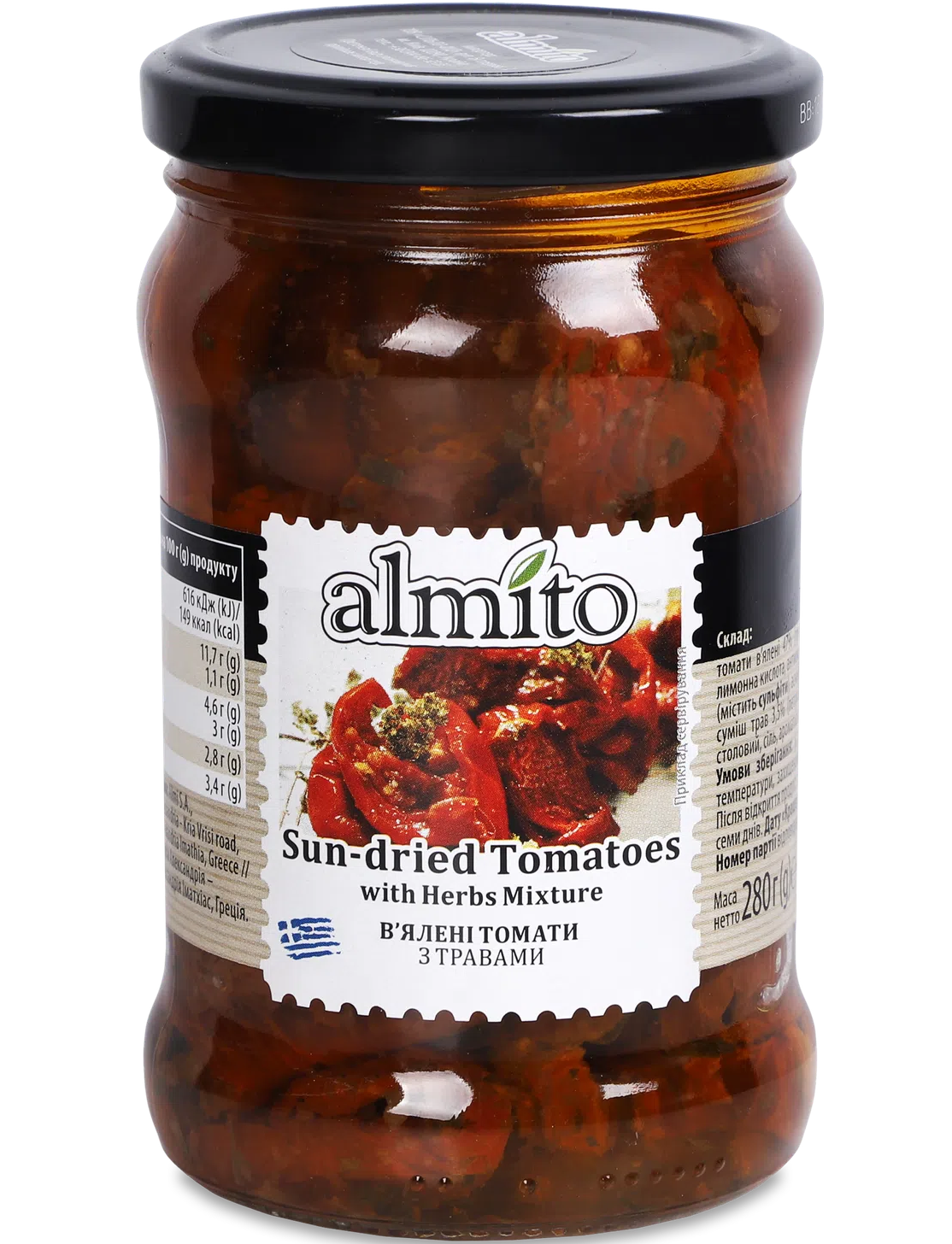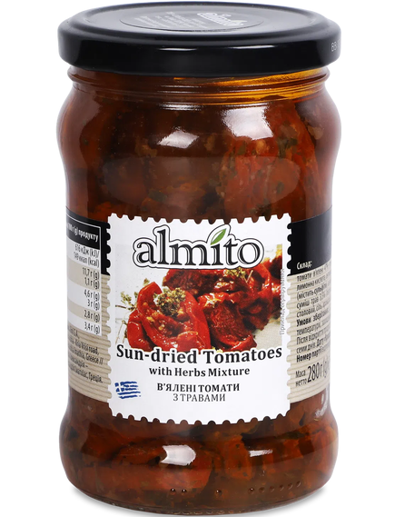 Склад: рапсова олія, томати в'ялені 47% (томати, сіль морська, лимонна кислота, антиоксиданти: метабісульфіт натрію (містить сліди сульфітів), асуорбінова кислота), суміш спецій 4,7% (петрушка заморожена, зелена цибуля заморожена, часник пастоподібний), оцет спиртовий, сіль морська, ароматизатор.