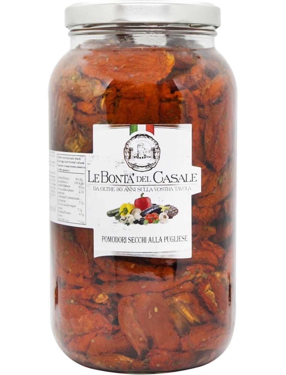 Склад: регідратовані сушені помідори 63%, соняшникова олія 34%, винний оцет, сіль, ароматичні трави, спеції, регулятор кислотності: лимонна кислота, антиоксидант: L-аскорбінова кислота.