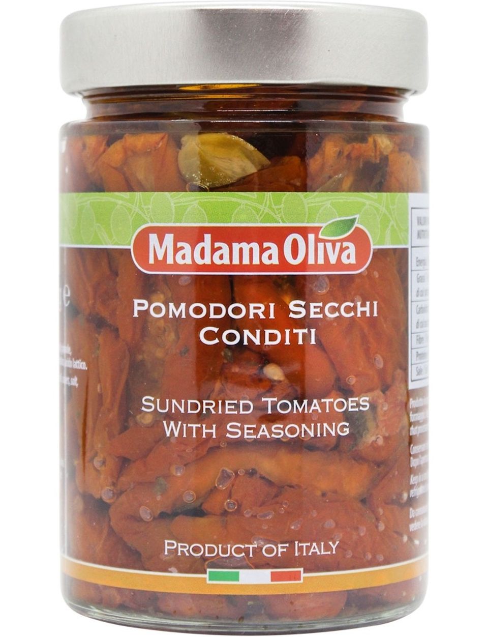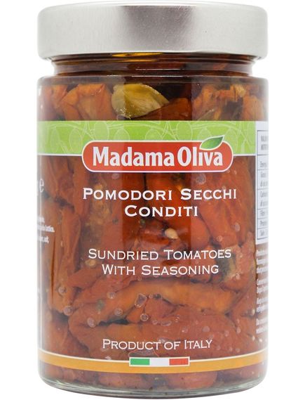 Склад: в’ялені помідори, соняшникова олія, каперси, сіль, спеції, підкислювач: оцтова кислота, молочна кислота.