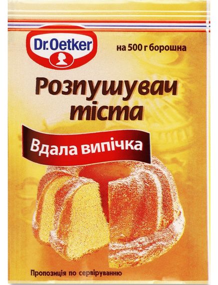 У 1893 році Др Аугуст Оеткер визначив точну кількість розпушувача, необхідне для 500 г борошна і розфасував продукт в пакетики по 10 г. І ось вже більше 100 років розпушувач тіста Dr. Oetker допомагає господиням надавати тісту об’єм і рівномірну пористу структуру. Розпушувач тіста на відміну від соди не залишає запаху.