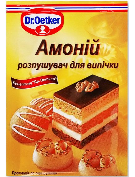 Склад: розпушувач: бікарбонат амонію Е503іі, антизлежувач: карбонат магнію (Е504).