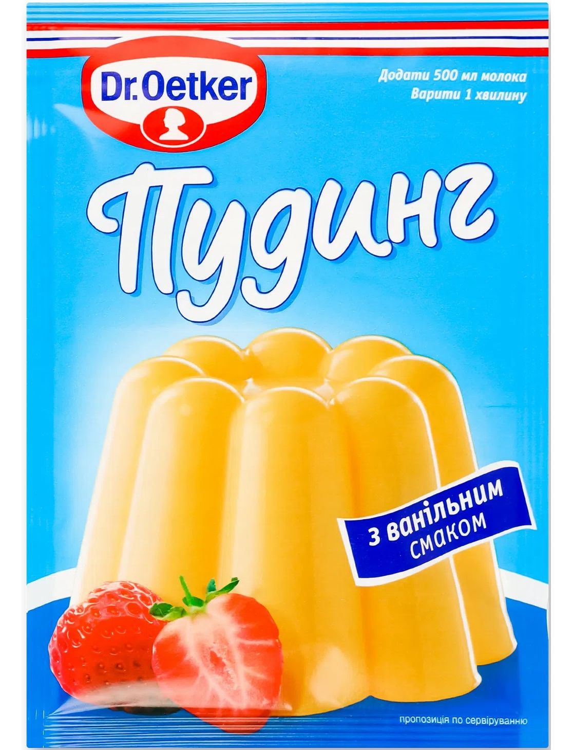 Взяти із загальної кількості молока (0.5 літра) 4 ст. ложки і змішати їх з вмістом пакета разом з 2-3 ст. ложками цукру. Молоко, що залишилося, довести до кипіння, зняти з вогню і, постійно перемішуючи, додати приготовлену раніше суміш. Пудингову суміш ще раз довести до кипіння і варити, злегка перемішуючи, протягом 1хв. Гарячий пудинг розлити у формочки, попередньо обполоскавши їх холодною водою, дати охолонути. Для приготування пінистого ванільного соусу/крему, змішайте вміст пакету з 6 ст. ложками холодного молока, 3 ст. ложками цукру та одним яєчним жовтком. Закип'ятіть молоко, що залишилось. Зніміть з плити та додайте попередньо приготовлену суміш. Варити на слабкому вогні протягом 1хв. Зніміть з плити та дайте суміші охолонути протягом 10-15хв., періодично помішуючи. Збийте яєчний білок в піну і обережно додайте його в приготовленний пудинг. Вміст 1 упаковки розрахований на 1/2л (500мл) молока (4 порції готового пудингу).