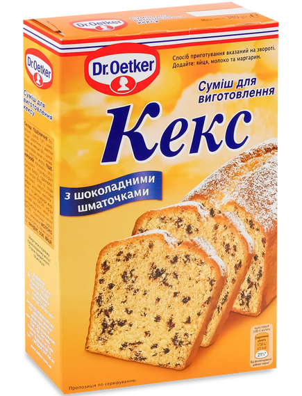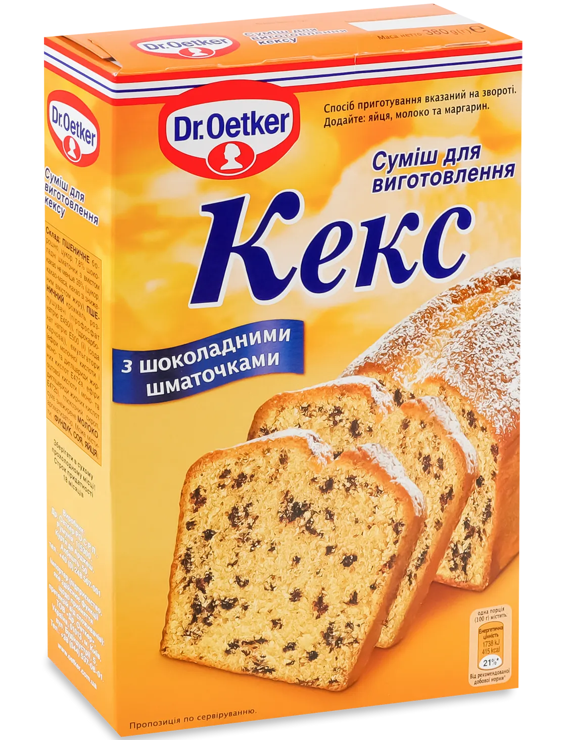 Склад: пшеничне борошно, цукор, 7.8% шоколадні шматочки з вмістом какао не менше 35% (цукор, какао-маса, какао зі зниженим вмістом жиру, цукровий розчин, какао-масло, лецитин соєвий), пшеничний крохмаль, розпушувачі (пірофосфат натрію Е450(i), гідрокарбонат натрію Е500(ii) (сода харчова)), емульгатори (ефіри молочної кислоти і моно- та дигліцериди жирних кислот Е472е, ефіри оцтової кислоти і моно- та дигліцериди жирних кислот Е472b), глюкозний сироп, сухе знежирене молоко, ароматизатор.