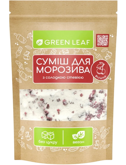 Склад: вершки кокосові сухі, натуральний підсолоджувач Солодка Стевія Green Leaf (натуральний підсолоджувач – ерітрітол*, натуральний екстракт солодкої трави стевії GREENLEAF 2,5%), шматочки вишні сублімовані 8,0 %, харчові волокна, комплекс натуральних загусників, кислота лимонна, натуральний ароматизатор, лецитин соняшниковий.