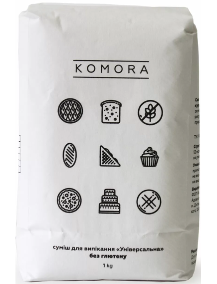 “Універсальна” суміш KOMORA складається з борошна: рисового, зеленої гречки, кукурудзяного крохмалю та загущувача.