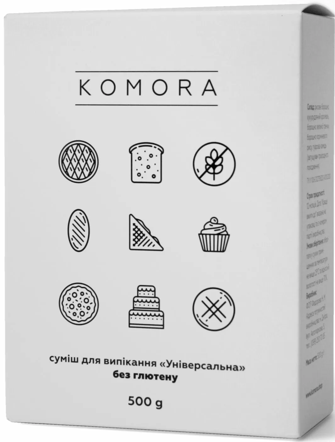 “Універсальна” суміш KOMORA складається з борошна: рисового, зеленої гречки, кукурудзяного крохмалю та загущувача.