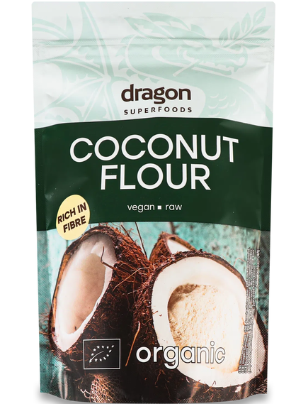 Dragon Superfoods Борошно кокосове органічне 200 г – це натуральне кокосове борошно, виготовлене з висушеної та знежиреної м’якоті кокоса. Воно має ніжний кокосовий аромат, містить велику кількість клітковини та є чудовою альтернативою традиційному борошну для безглютенової випічки та інших корисних страв.