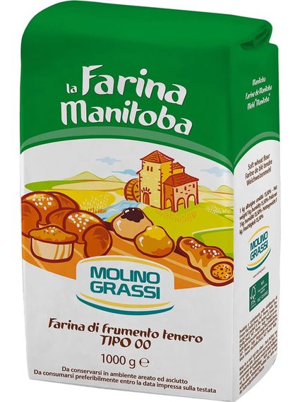 Традиційне італійське пшеничне борошно найвищої якості - Манітоба. Створене в процесі максимального подрібнення пшеничних зерен м'яких сортів типу "00" - з підвищеним вмістом білків. Має повітряну текстуру і білий колір.
