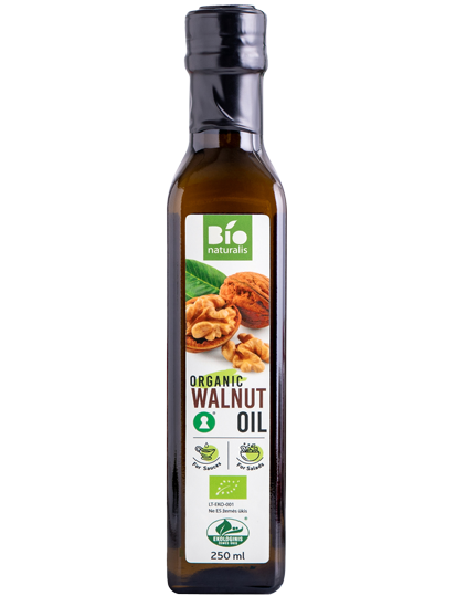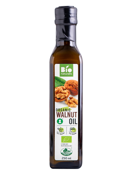 Біоприродна органічна олія волоського горіха холодного віджиму пресується та вирощується без використання будь-яких хімікатів. Також ретельно проціджують. Для виробництва цієї олії використовуються лише органічні волоські горіхи найвищої якості - потім їх сушать і холодно пресують.