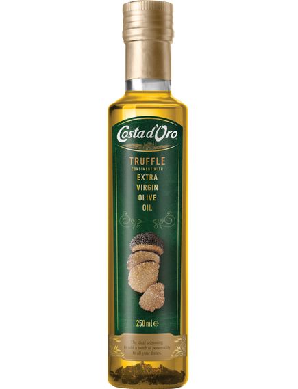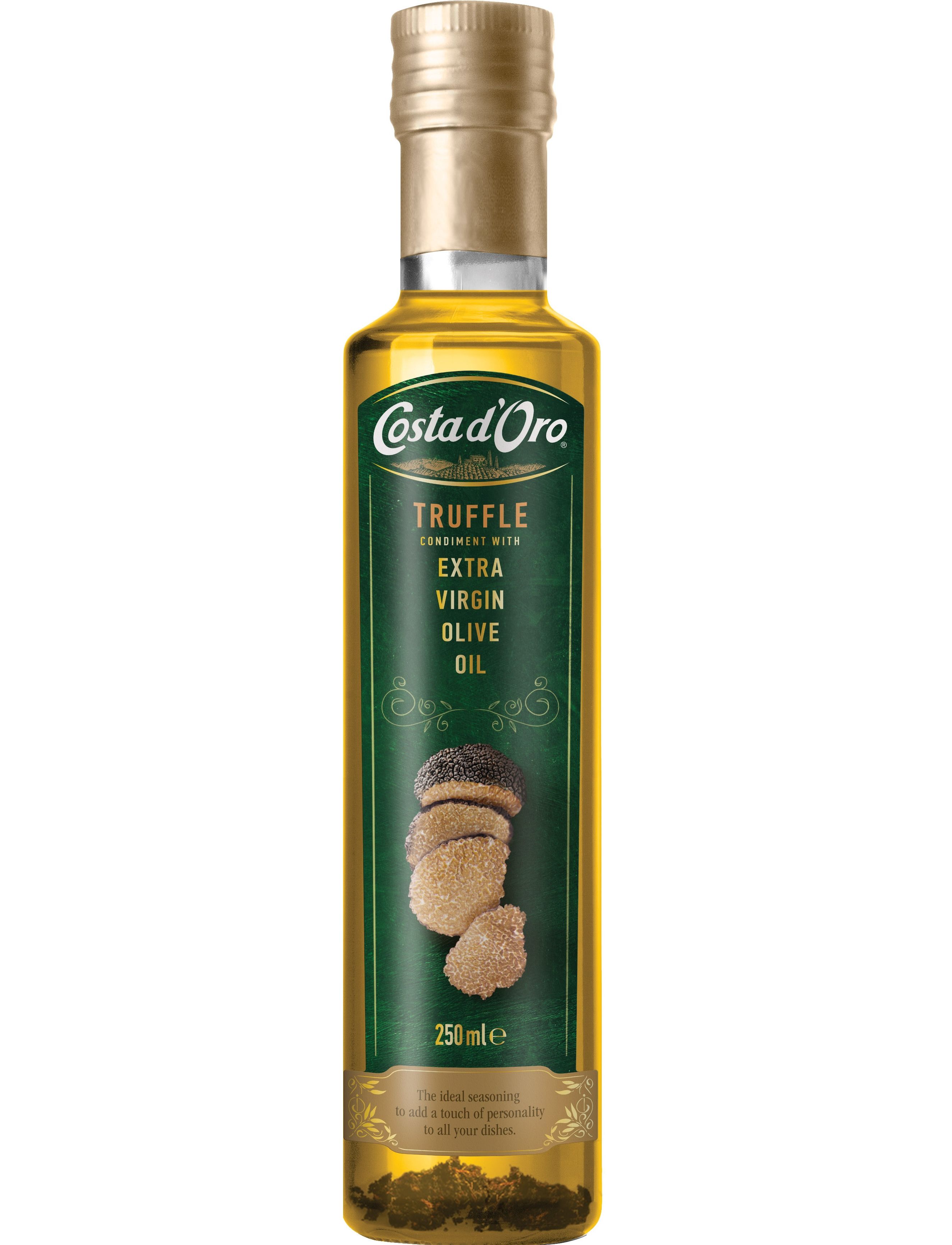 Costa d'Oro Олія оливкова Extra Virgin з трюфелем — це високоякісна оливкова олія екстра вірджин (extra virgin) з додаванням екстракту трюфеля. Вона поєднує у собі всі переваги оливкової олії першого віджиму та вишуканий смак та аромат трюфелів.