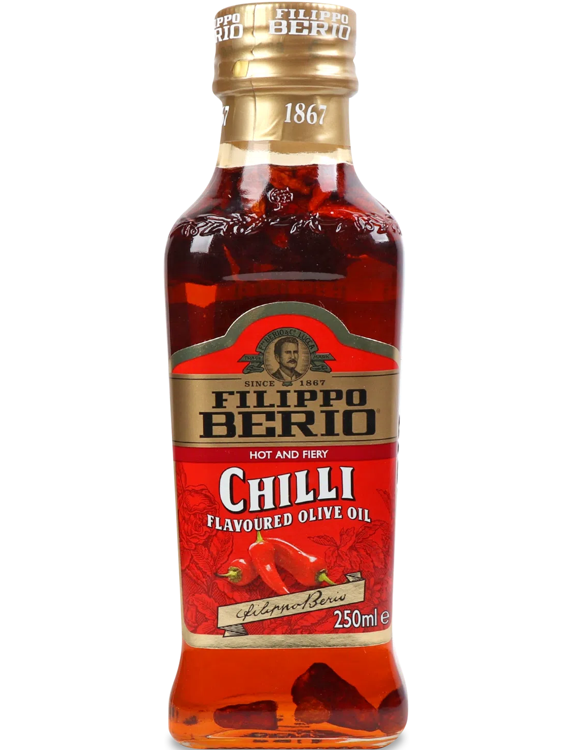 Filippo Berio Олія оливкова Extra Virgin з перцем чилі — це оливкова олія першого холодного віджиму (Extra Virgin), до складу якої додається натуральний екстракт перцю чилі для надання їй пряного, гострого смаку та аромату. Цей продукт поєднує в собі всі корисні властивості оливкової олії Extra Virgin і пікантний, трохи гострий відтінок, характерний для перцю чилі.