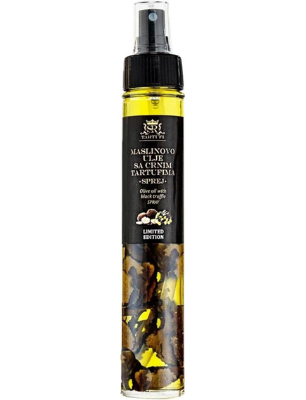 Оливкова олія у вигляді спрею, яка містить багато платівок чорного трюфеля. Тепер Ви дуже легко можете приправити будь-яку улюблену страву трюфельною олією. Після того, як пляшка буде витрачена, Ви можете налити свою оливкову олію, і вона буде збагачена смаком чорного трюфеля. Це чудова ідея для подарунка.