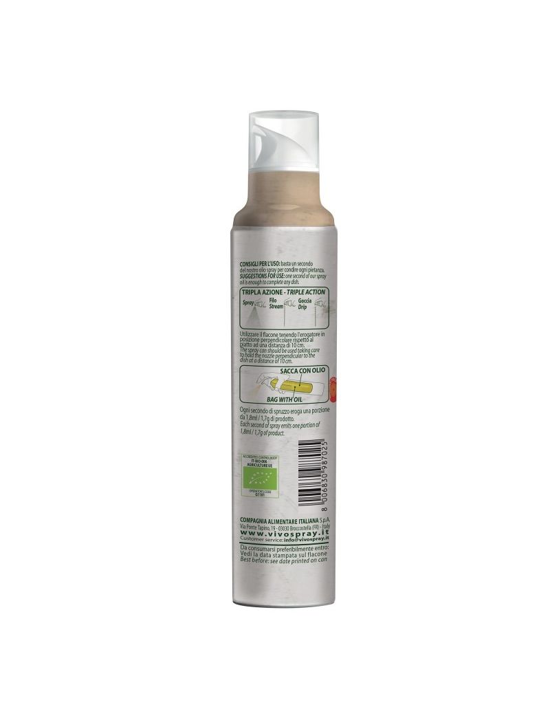 Завдяки технології «мішка на клапані» спеціальна пляшка Vivo Spray дозволяє скоротити споживання приблизно на 90% (флакон об’ємом 250 мл фактично еквівалентний приблизно 3 літрам звичайної пляшки олії) і захистити вміст від повітря і світло протягом тривалого часу. Це дозволяє зберегти всі цінні властивості приправи незмінними та завжди залишати її свіжою, наче її щойно віджали. Кожна секунда розпилення забезпечує 1,8 мл/1,7 г (15 ккал) продукту, достатнього для приправи кожної страви.