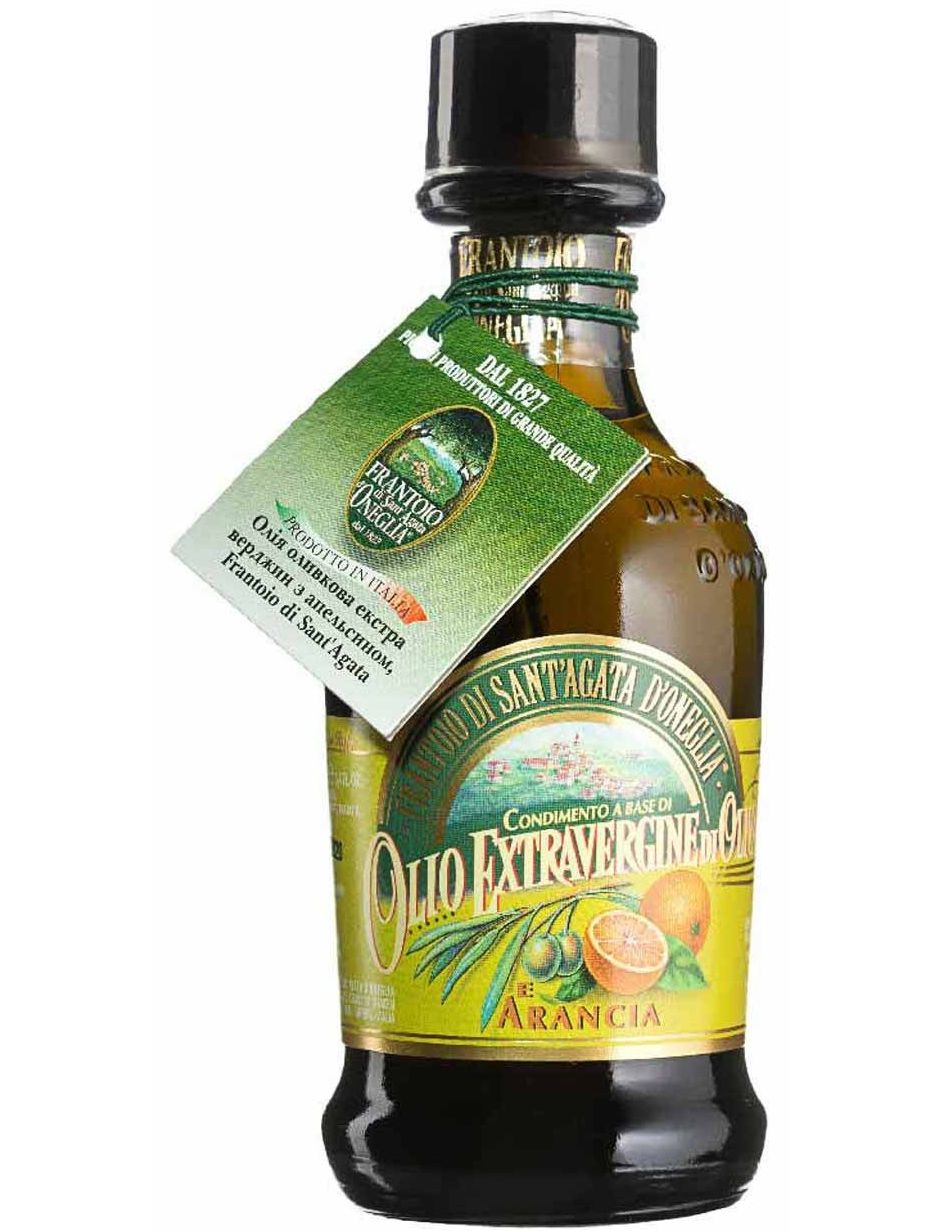 Frantoio di Sant'Agata d'Oneglia, Olio Extra Vergine di Oliva e Arancio - італійська оливкова олія "екстра вірджин" найвищого класу з ароматом апельсина. Олію отримують методом холодного віджиму ретельно відібраних сортів оливок. Усі оливки вирощуються на висоті від 200 до 500 метрів над рівнем моря. Свіжий апельсин додається на етапі пресування оливок. Незвичайний смак створений природним шляхом. Оливкова олія з ароматом апельсина відмінно доповнить смак рибних страв, екзотичних салатів або пирогів.