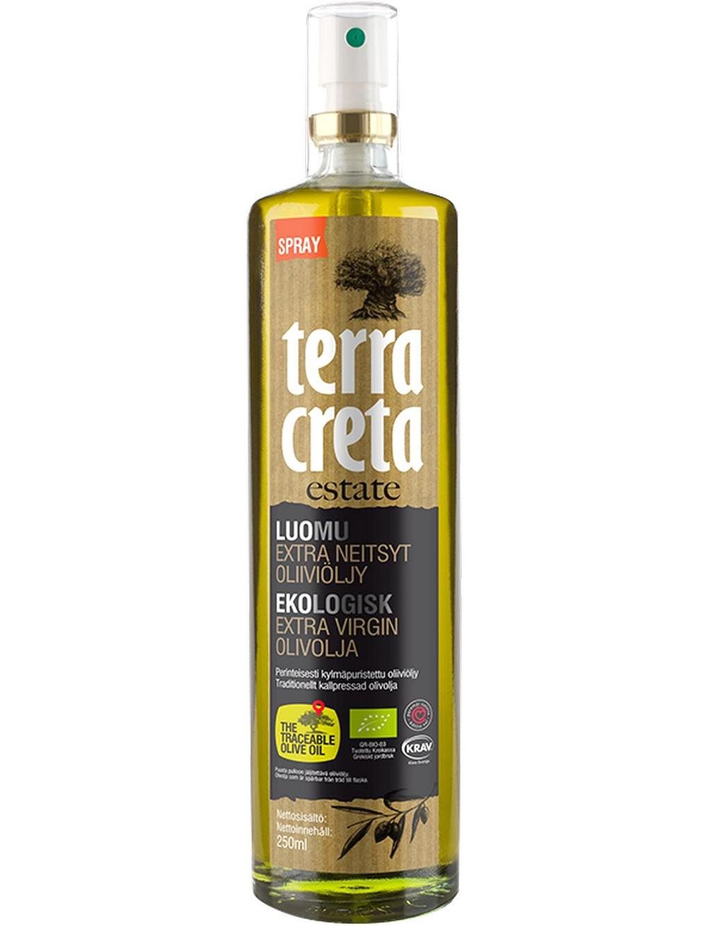 Оливкова олія першого віджиму Terra Creta Estate у скляній пляшці з розпилювачем.