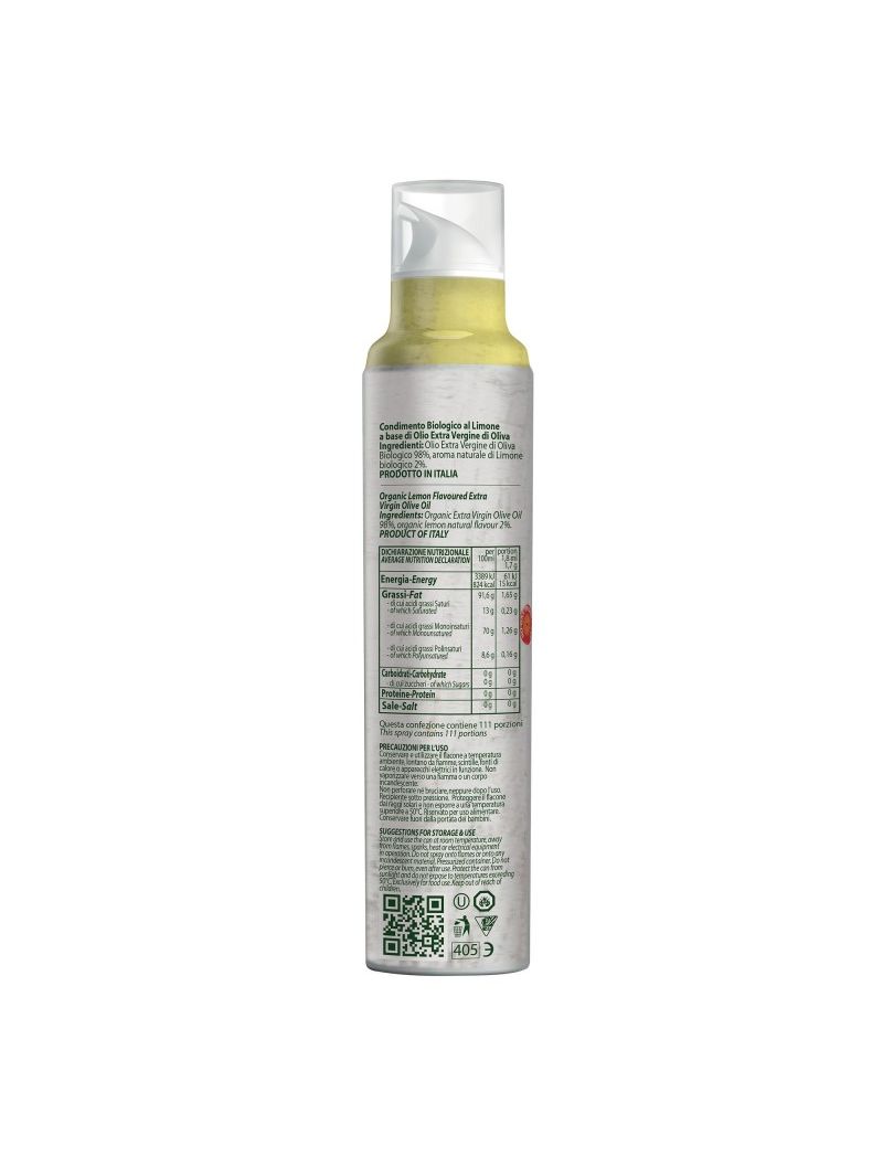 Лимонний спрей-приправа на основі органічної оливкової олії першого віджиму та ефірної олії органічних сицилійських лимонів.