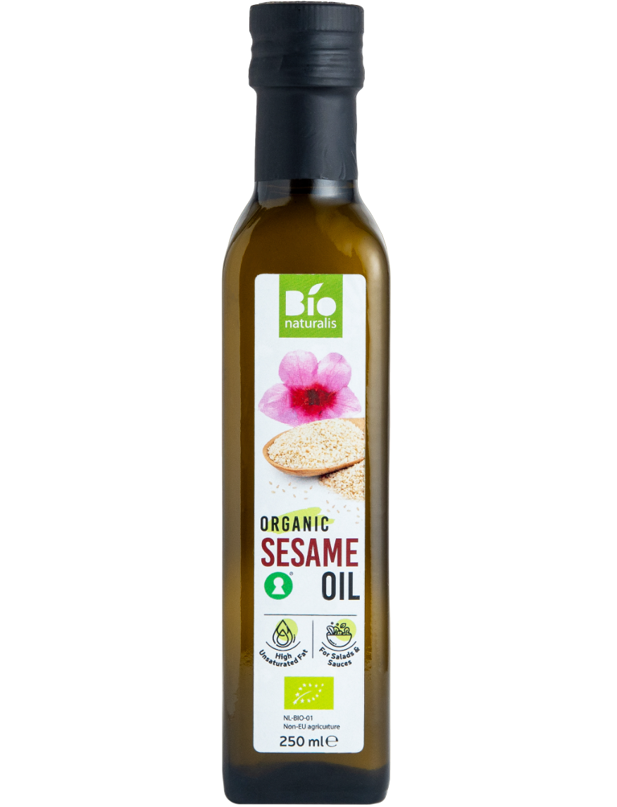 Органічна нерафінована кунжутна олія холодного віджиму Bionaturalis . Масло містить поліненасичені жирні кислоти. Масло має приємний смак і аромат.