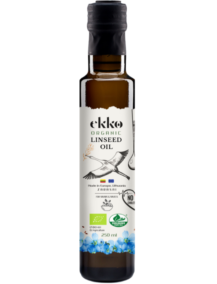 Органічна нерафінована льняна олія холодного віджиму EKKO пресується в Литві, на нашому заводі в Зарасаї. Ця олія виробляється з насіння льону, вирощеного на органічних фермах і віджатого за найсучаснішою технологією холодного віджиму.