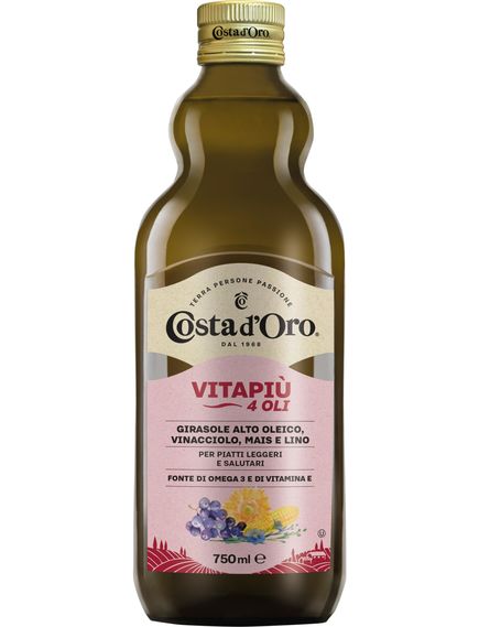 Costa d'Oro Суміш 4 рослинних олій Vitapiu — це готова суміш олій, що складається з п’яти різних рослинних олій, яка створена для забезпечення збалансованого споживання корисних жирів. Бренд Costa d'Oro пропонує цю суміш як універсальний продукт для щоденного використання в кулінарії, об'єднуючи різні види олій з різними корисними властивостями.