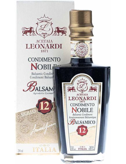 Leonardi Бальзаміко Витриманий 12 років — це високоякісний бальзамічний оцет, виготовлений в регіоні Модена (Італія) за традиційною технологією з використанням виноградного соку сортів Trebbiano та Lambrusco. Цей оцет має витримку 12 років, що дозволяє йому набути більш глибокого та складного смаку порівняно з молодшими оцтями, але при цьому він залишається більш доступним за ціною, ніж оцти з довшою витримкою, наприклад, 30 чи 50 років.