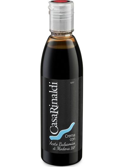 Наш крем з бальзамічним оцтом Modena PGI є унікальною варіацією бальзамічного оцту Casa Rinaldi з Модени. Це чорна та блискуча приправа, що характеризується щільністю 1,22, здатна додати типовий солодкий аромат оцту кожній страві, приємний на смак завдяки збалансованому кисло-солодкому смаку. Наш особливий рецепт із високим вмістом вареного виноградного сусла робить його особливим, вишуканим і незамінним продуктом на кухнях високого класу, ідеальним як для покращення смаку страв, так і для збагачення їх унікальними прикрасами.