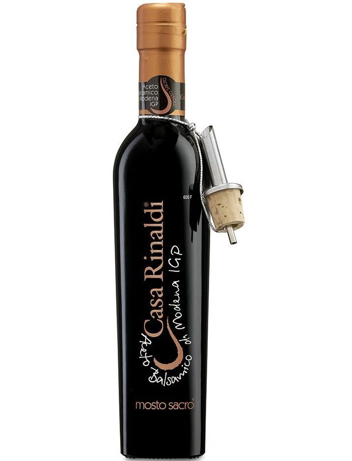 Бальзамічний оцет Casa Rinaldi із Модени PGI «Mosto Sacro» виділяється своїм інтенсивним чорним кольором і високою щільністю 1,3. Консистенція робить його особливим продуктом, як і аромат, який нагадує стиглі фрукти. При спробі можна відчути весь його солодкий, трохи кислуватий, але все ж оксамитовий смак.
