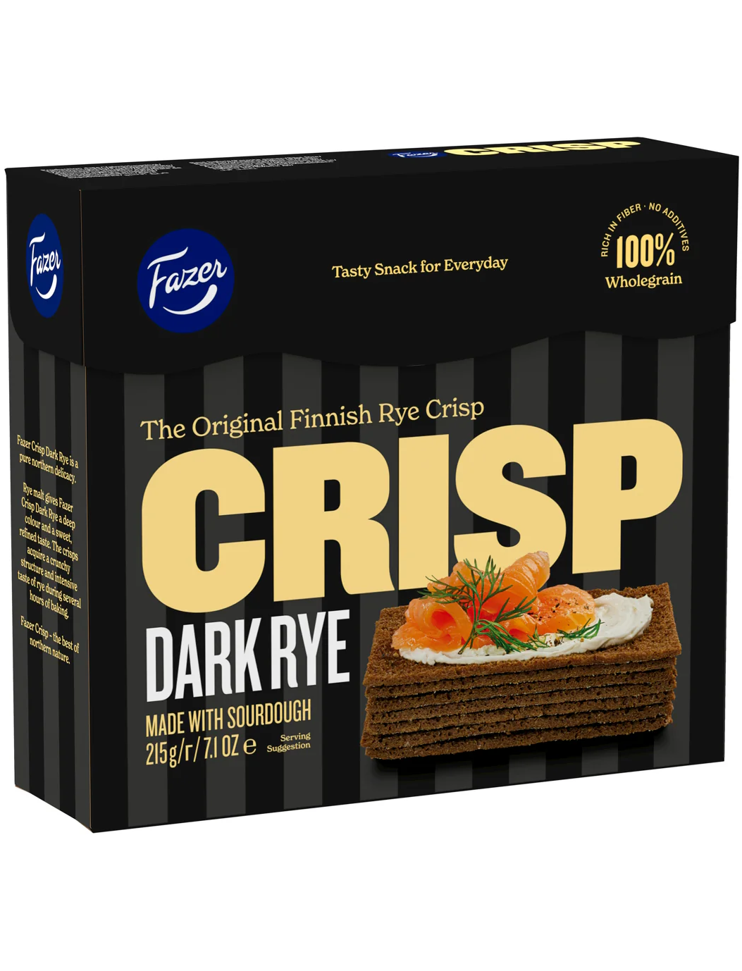 Fazer Crisp – це фінський делікатес із чудовим смаком та хрусткою структурою. Чіпси Fazer випікаються зі 100% цільного зерна та природно багаті на клітковину. Вони також містять багато життєво важливих вітамінів та мінералів, таких як вітамін В, та залізо, цинк та магній, які різними способами покращують загальний стан здоров'я. Випікання на заквасці – це унікальний та природний процес, який триває до 20 годин. Жодних добавок не потрібно, а результатом є справжній та насичений смак жита. Випікання на заквасці також допомагає розщеплювати стійкі крохмалі, білки та фітати в зернах, що полегшує їх перетравлення організмом та дозволяє вам засвоювати більше поживних речовин.