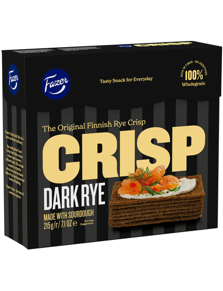 Хрумкі житні чіпси Fazer Crisp Dark Rye – це справжній північний делікатес. Житній солод надає чіпсам Fazer Crisp Dark Rye темного кольору та солодкого, вишуканого смаку. Хрумкі чіпси набувають хрусткої структури та насиченого смаку жита протягом кількох годин випікання.