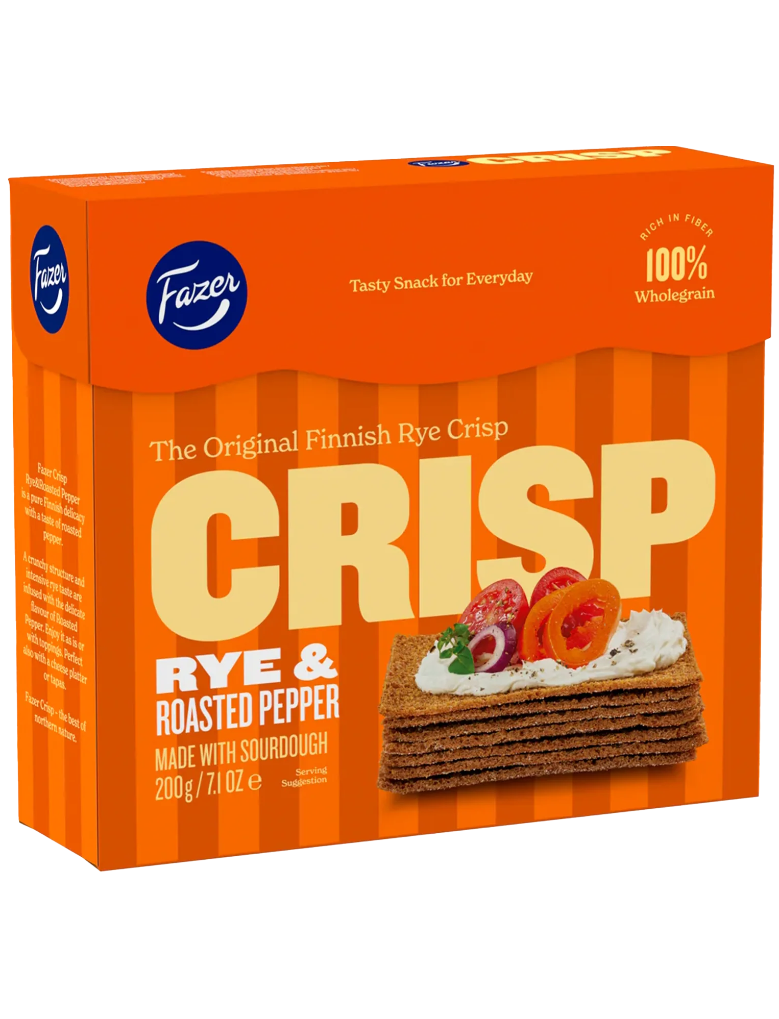 Оригінальні фінські житні хрусткі коржики з чудовим смаком смаженого перцю. Ідеальна закуска між основними прийомами їжі. Випікаються у Фінляндії на заквасці та з цільного зерна, багаті на клітковину та не містять добавок. Підходять для веганів.