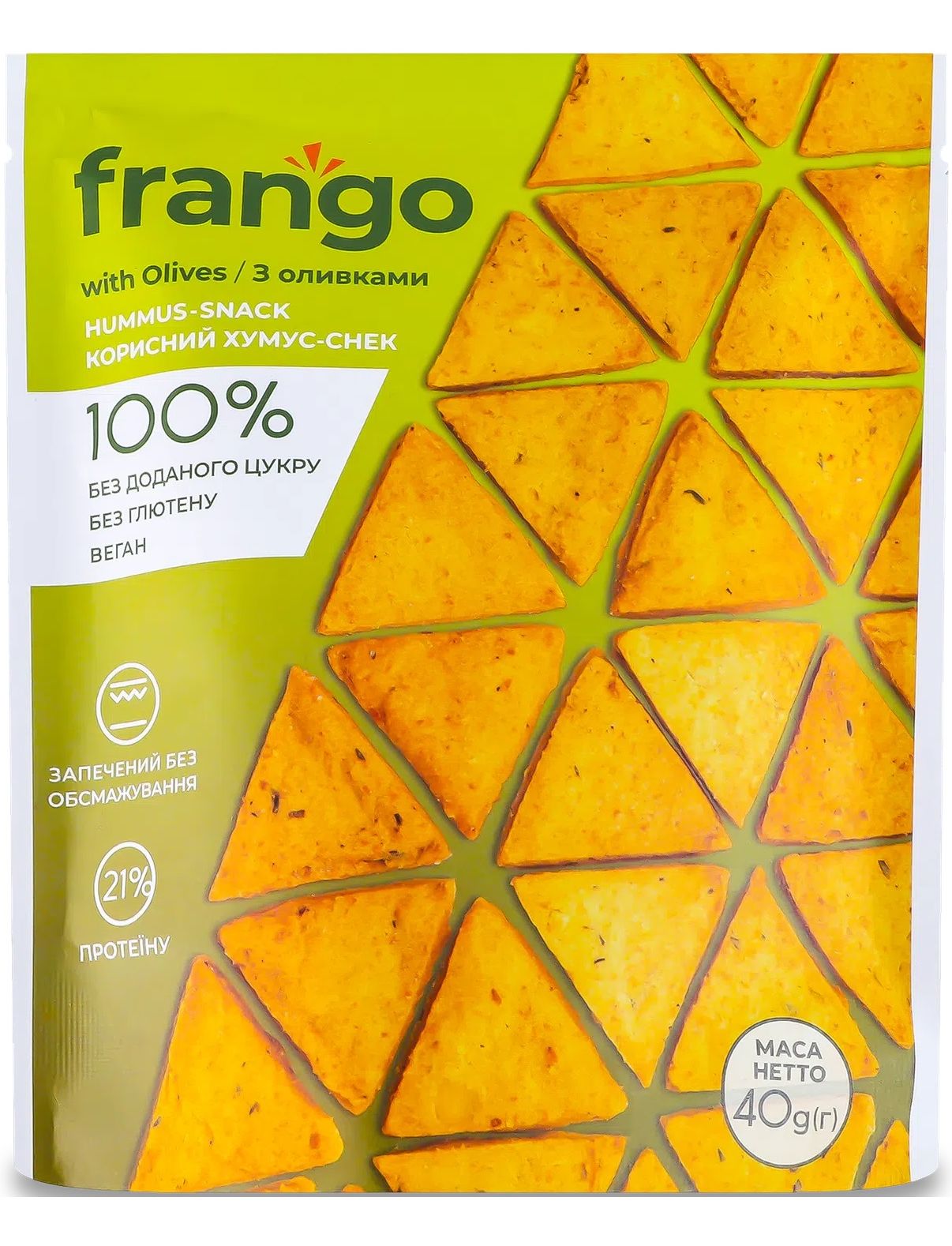 Склад: хумус класичний 90% (нутове пюре, вода, тахіні, олія рослинна соняшникова, сік лимона, сіль, зіра мелена, часник сухий), оливки (не менше 5%), борошно нутове, борошно кукурудзяне, чебрець сушений