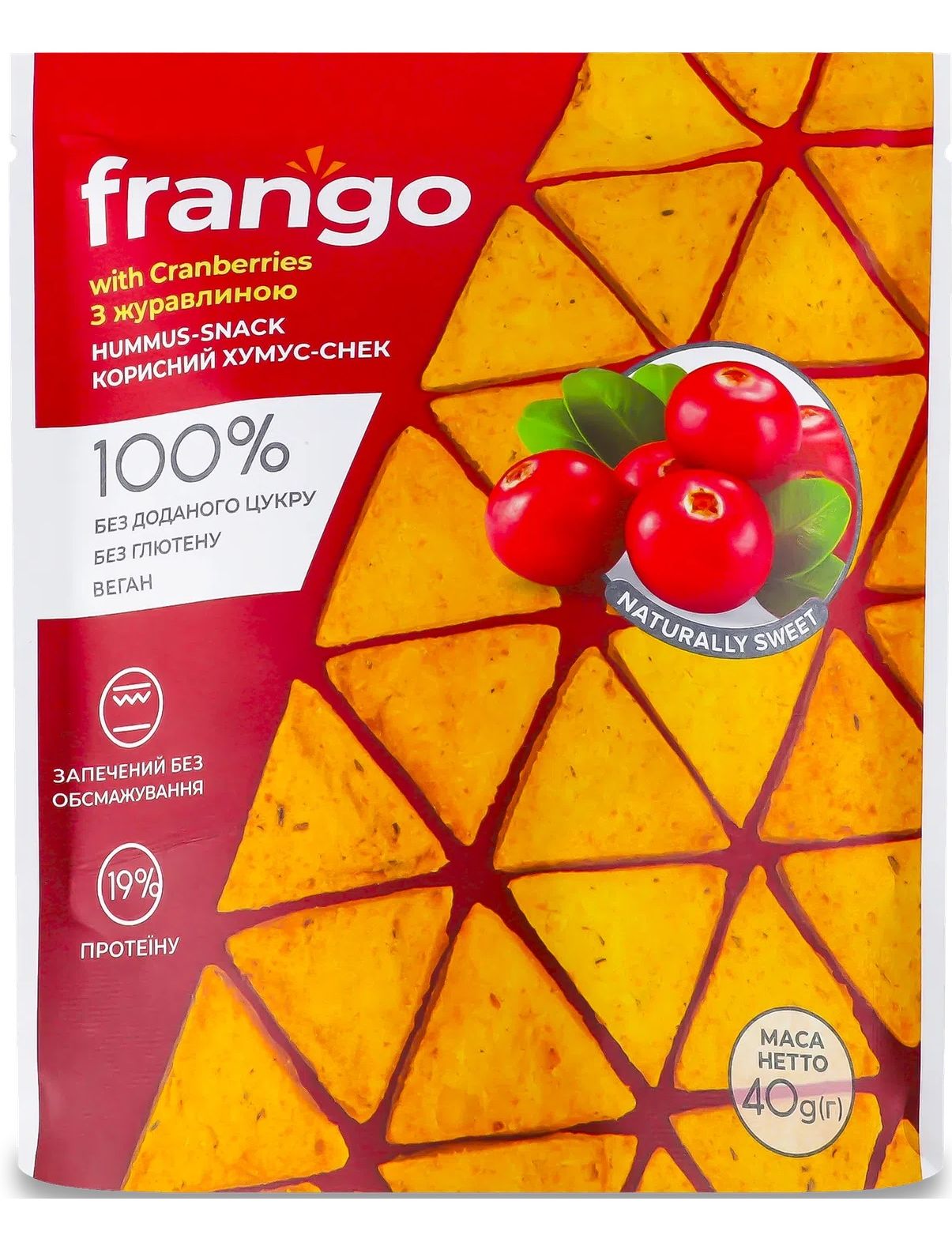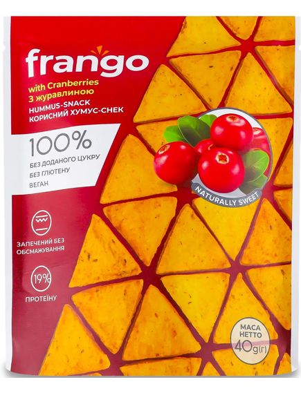 Це натуральна солодка закуска, виготовлена шляхом зневоднення традиційного хумусу з додаванням кукурудзяного борошна, сушеної журавлини та сиропу з топінамбура.