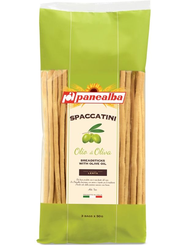 Хрускість хлібних паличок Spaccatini із золотистою поверхнею та надзвичайною автентичністю має ніжний природний смак вишуканої оливкової олії.