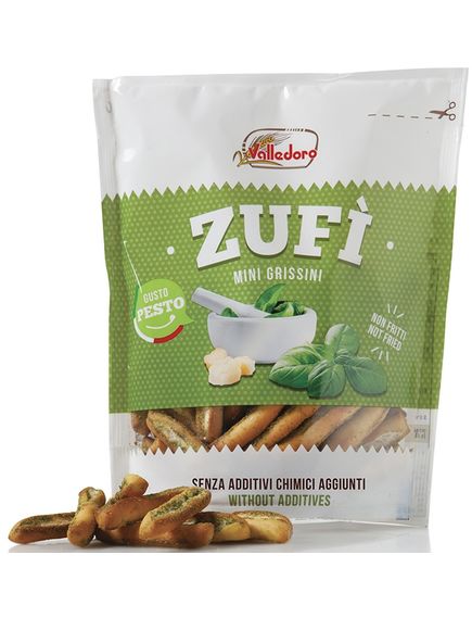 Розсипчасті та смачні міні-хлібні палички, змащені олією та приправлені базиліковим песто. Ідеально підходять як закуска до смачних аперитивів, а також як смачні закуски в будь-який час дня. У практичній упаковці 100 г.