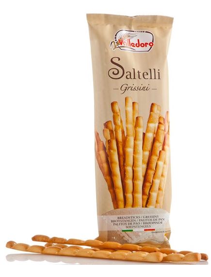 Хлібні палички, нові за формою та смаком, з оливковою олією першого віджиму та посолені на поверхні. Маючи хвилясту форму, вони хрусткі, ароматні та без хімічних добавок. Ідеально підходить для оригінального супроводу будь-якої страви, Saltelli також ідеально підходить для смачних аперитивів. Не містять тваринних жирів і консервантів, вони є джерелом клітковини.