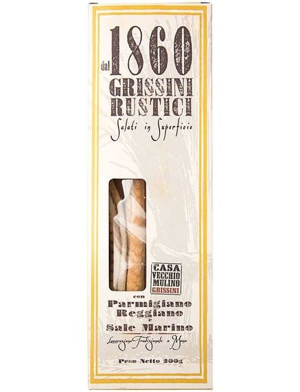 «Рустічі» – це вишуканіша версія грисіні, що розгортається вручну та вирізняється особливо легким та хрустким тістом. Рецепт складається з найкращого італійського пшеничного борошна, оливкової олії першого віджиму та 3% морської солі, додатково очищеної 4% пармезаном реджано. Це особливе поєднання високоякісних інгредієнтів забезпечує насичений смак, ідеальний як закуска або як доповнення до антипасті та сирних тарілок. З кожним шматочком на столі з’являється автентичний смак Італії – справжній делікатес для цінителів.