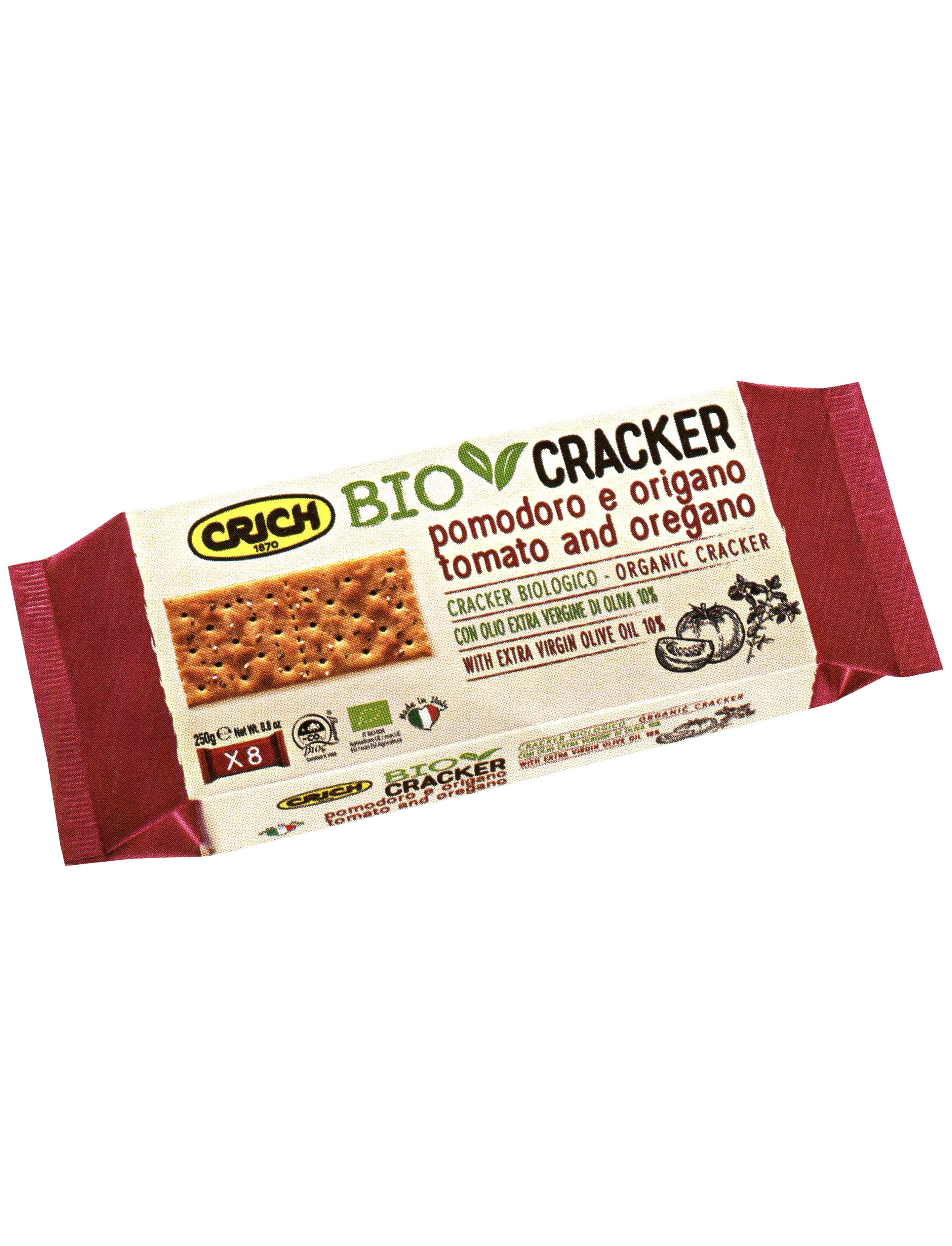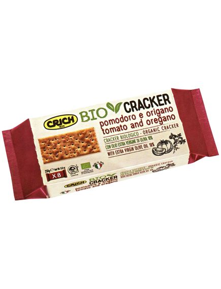 Склад: *пшеничне борошно 83%, *оливкова олія першого віджиму 9,9%, *томатний порошок 1,9%, сіль, регулятор кислотності: гідрокарбонат натрію, *маточні дріжджі 0,3%, *ячмінне борошно з солодом, *орегано 0,3%, *пивні дріжджі, антиоксидант: *екстракти розмарину. *Органічний інгредієнт.
