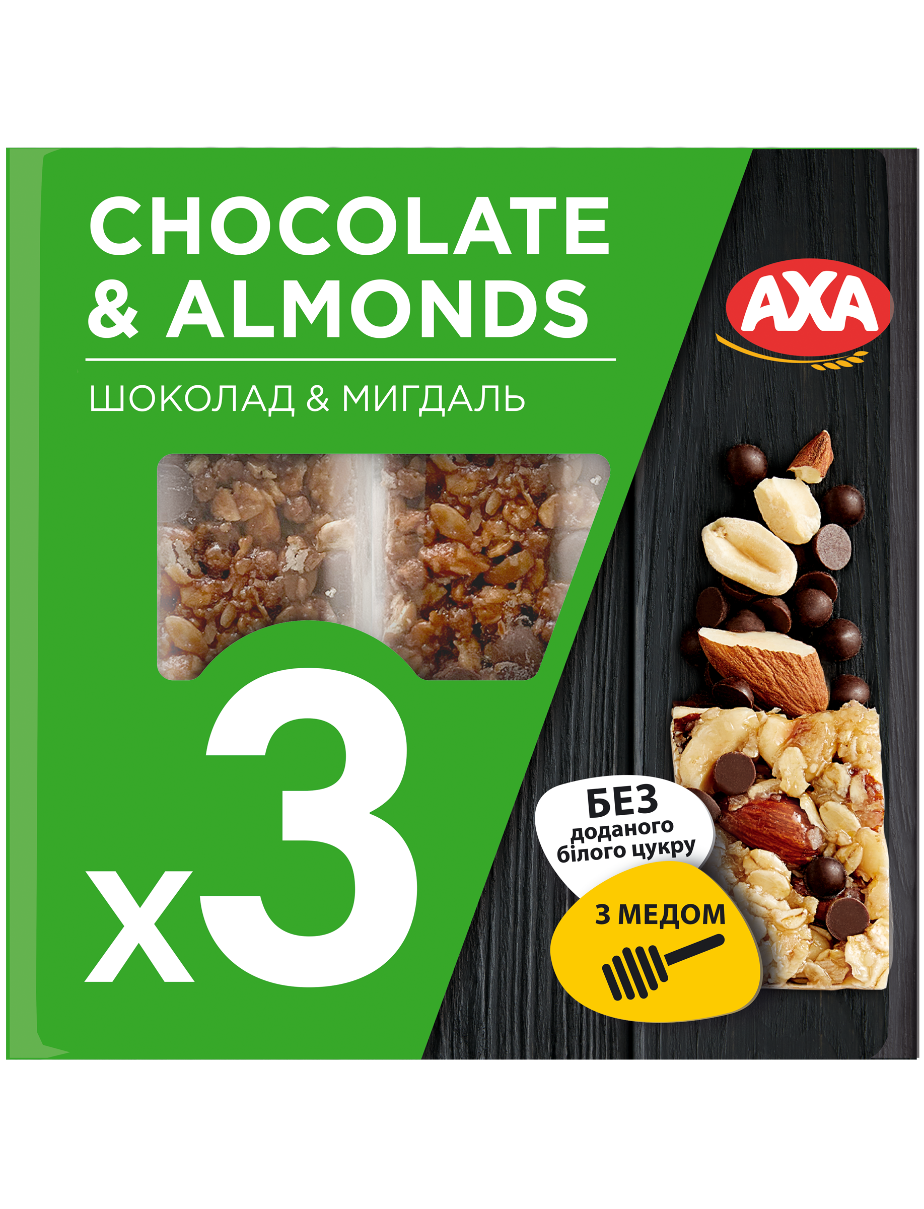Склад: пластівці вівсяні 32,9%, арахіс смажений 21.7%, патока крохмальна, ядро горіха мигдалю смажене 10,5%, мед натуральний 5,1%, маса шоколадна чорна з підсолоджувачами 4,9%(какао терте, наповнювач: харчові волокна, какао масло зі зниженим вмістом жиру 10-12%, підсолоджувачі , емульгатор (соєвий лецитин, ароматизатор ванілін), сік яблучний концентрований, олія пальмова, загущувач: мальтодекстрин, вологоутримуючий агент: гліцерин, емульгатор соєвий лецитин, сіль кухонна, регулятор кислотності: лимонна кислота.