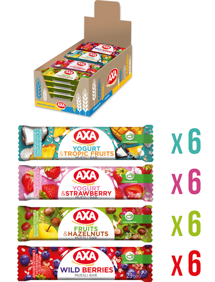 6 шт- Зерновий батончик "Лісові ягоди" 23 гр 6 шт- Зерновий батончик з фруктами та горіхами 23 гр 6 шт- Батончик з йогуртом та тропічними фруктами 25 гр6 шт- Зерновий батончик з йогуртом та полуницею 25 гр