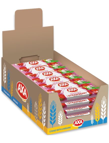Склад: пластівці вівсяні (26,8%), глазур біла зі смаком йогурту 20 % (цукор, олія рослинна ( кокосове масло, масло пальмового ядра, пальмова олія, масло ши), суха молочна сироватка, йогуртовий порошок, емульгатор соєвий лецитин)), патока крохмальна, рисові кульки12,2% (крупа рисова, цукор, ячмінно-солодовий екстракт, сіль кухонна, олія кукурудзяна, емульгатор соєвий лецитин),цукор, кукурудзяні пластівці7,4% (крупа кукурудзяна, цукор, сіль кухонна), шматочки сушеної полуниці (2,8%), олія пальмова, загущувач: мальтодекстрин, концентрат яблучного соку, шматочки сублімованої полуниці, мед натуральний, вологоутримуючий агент: гліцерин, какао-порошок, емульгатор: соєвий лецитин, ароматизатор: полуниця, сіль кухонна, регулятор кислотності: лимонна кислота. Може містити сліди пшениці, горіхів кеш’ю, фундука, мигдалю.