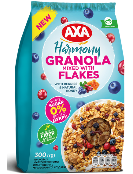 Склад: пластівці вівсяні (49.3%), мультизернові пластівці з мінералами 15%, сіль кухонна, антиоксидант Е306, мінеральний комплекс (цинк, мідь, йод, залізо, марганець, селен)), мед натуральний 14%, шматочки сушеної журавлини, 10.6%, олія соняшникова високоолеїнова рафінована дезодорована виморожена з антиоксидантом Е306, пшеничні кульки, борошно пшеничне 1с, чорниця сублімована 0.7%, ароматизатор ваніль, сіль кухонна, вітамін Е.