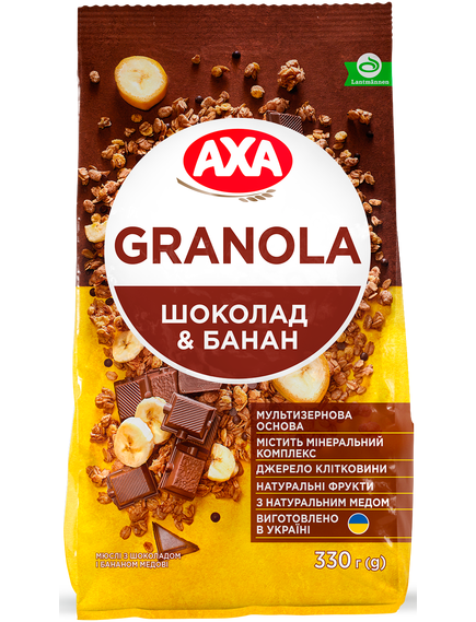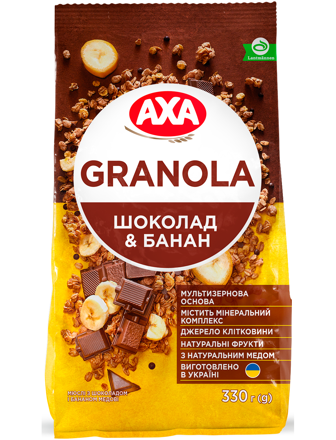 Склад: пластівці вівсяні 49%, цукор, кукурудзяні пластівці 8% (крупа кукурудзяна, цукор,сіль, кухонна), кульки пшенично – кукурудзяні 8%(пшениця, крупа кукурудзяна, цукор, сіль кухонна, емульгатор соєвий лецитин, олія соняшникова), олія соняшникова високоолеїнова рафінована дезодорована виморожена з антиоксидантом Е 306, сироп глюкозно – фруктозний, родзинки 3,6%, мед натуральний1,8%, маса кондитерська 1,2% (цукор, жир рослинний (олія пальмоядроява повністю гідрогенізована), какао-порошок зі зниженим вмістом жиру, емульгатор соєвий лецитин (Е 322), сіль кухонна, ароматизатор «шоколад»), банан сублімований 1,1%, какао порошок зі зниженим вмістом жиру, маса шоколадна чорна 0,5% (какао терте, цукор, какао-масло, емульгатор соєвий лецитин ( Е 322), ароматизатор «ванілін»), сіль кухонна, ароматизатор «ваніль», мінеральний комплекс (мідь, залізо, марганець, селен, цинк, йод), вітамін Е.