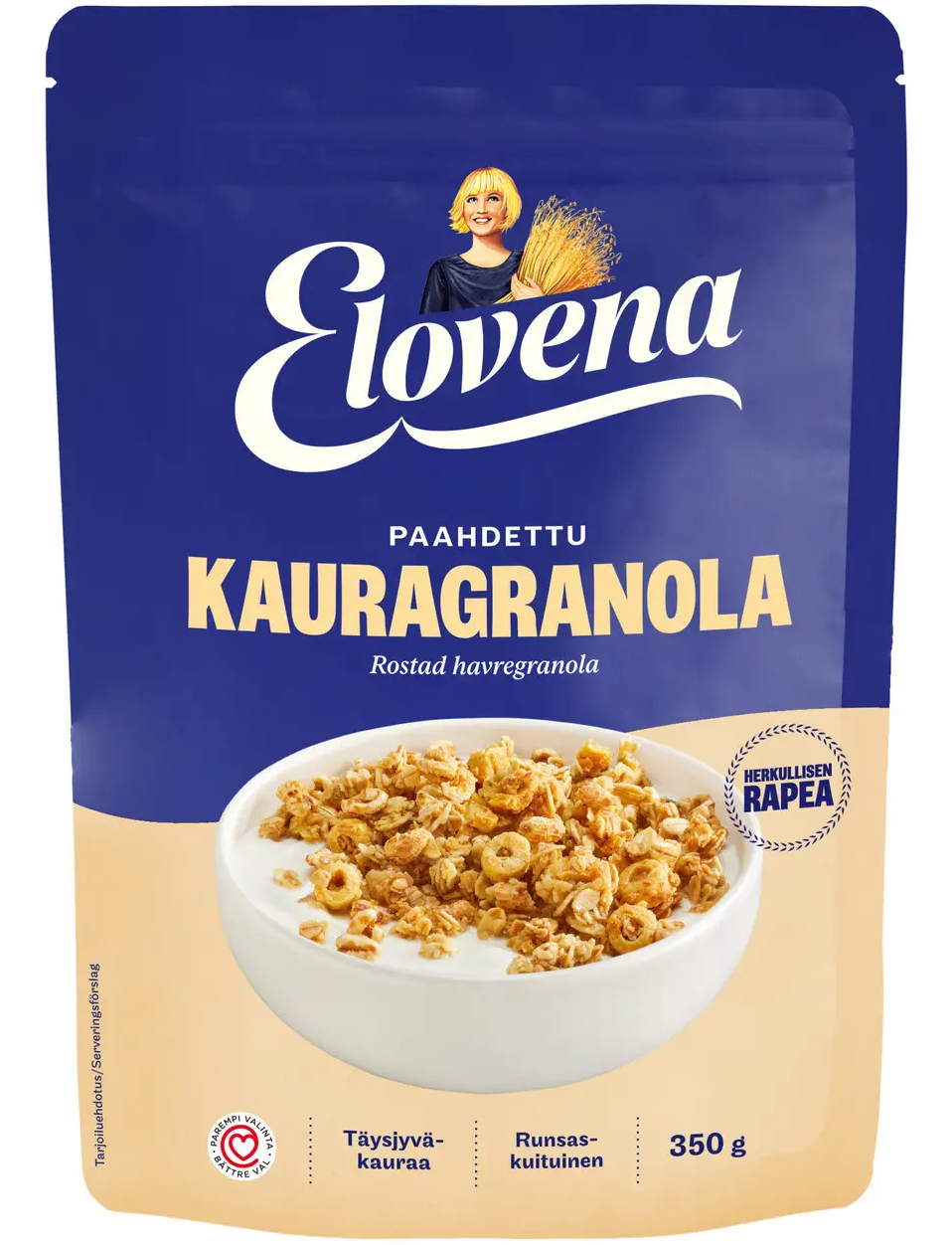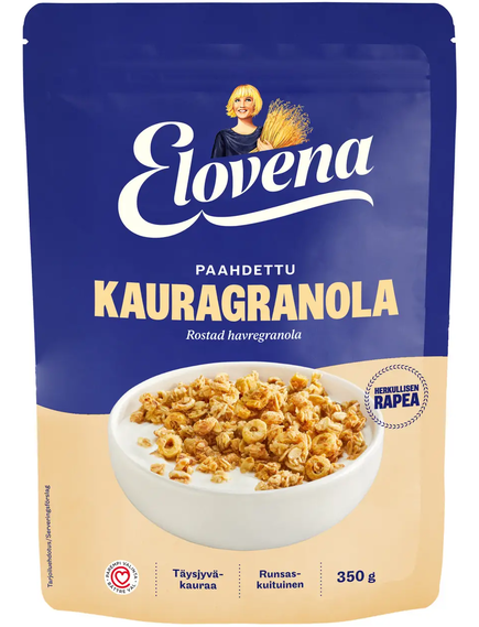 Вівсяна гранола Elovena — це хрустка гранола з великою кількістю вівса. Продукт із етикеткою «сердечко» має потрібну кількість солодкості, щоб підкреслити чудовий смак, і велику кількість клітковини, щоб шлунок був задоволений.