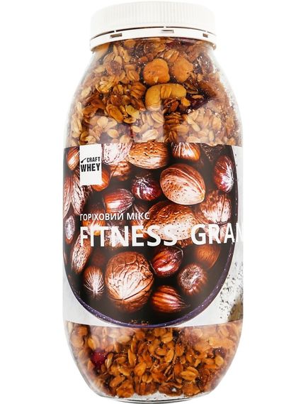 Склад: цільнозернові вівсяні пластівці, фундук, мигдаль, волоський горіх, кеш'ю, вишня, журавлина, мед, гарбузове насіння, насіння льону, кориця.