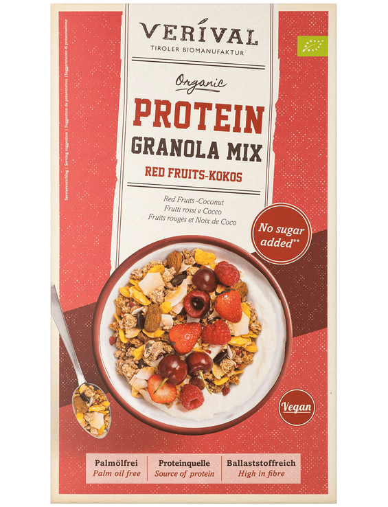 Шукаєте ідеальне поєднання злаків та граноли? Тоді наша протеїнова суміш граноли з червоними фруктами та кокосом – це правильний вибір для вас! Протеїнова гранола Verival поєднує хрусткі злаки та гранолу з кокосом, горіхами та фруктами, виготовлена без додавання цукру, підсолоджена лише фініками, злегка солодким мигдалем та фруктами. Суміш граноли також багата на рослинні білки, що допомагає вам нарощувати м’язи.