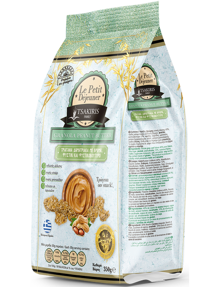 Склад: цільнозернові вівсяні пластівці (40%) (походження ЄС), кукурудзяні пластівці, коричневий цукор, арахіс, арахісове масло (10%), кокосова стружка, мальтит, сіль. Інформація для алергіків: продукт містить глютен, горіхи. Може містить сульфіти, сою, молоко.
