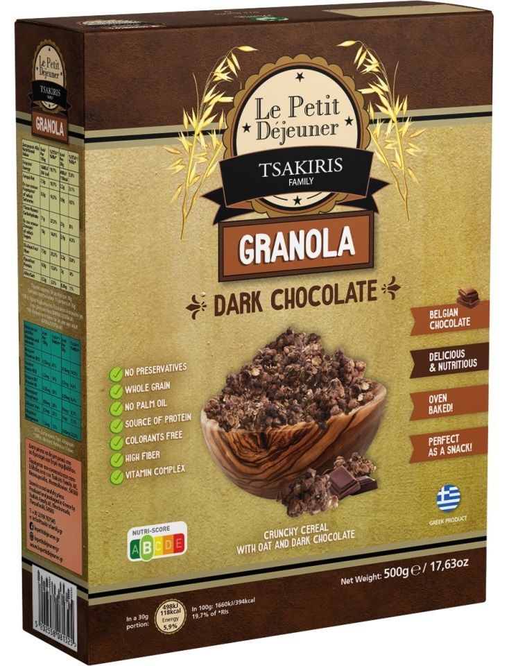 Склад: цільнозернові вівсяні пластівці (39,7%) (походження ЄС), глюкоза, кукурудзяні пластівці (кукурудзяна крупа (88%), цукор, екстракт ячмінного солоду, сіль, емульгатор: дигліцериди жирних кислот), цукор, рисові хрусткі (рисове борошно (69%), цукор, екстракт ячмінного солоду, сіль), шматочки чорного шоколаду (7,7%) (походження ЄС) (какао терте, цукор, емульгатор: соєвий лецитин, ароматизатор ванілін), какао-порошок, кокосова стружка, ароматизатор: екстракт шоколаду (0,12%) (ЄС), патока, сіль. Продукт містить овес, ячмінь. Може містити сульфіти, сою, молоко.
