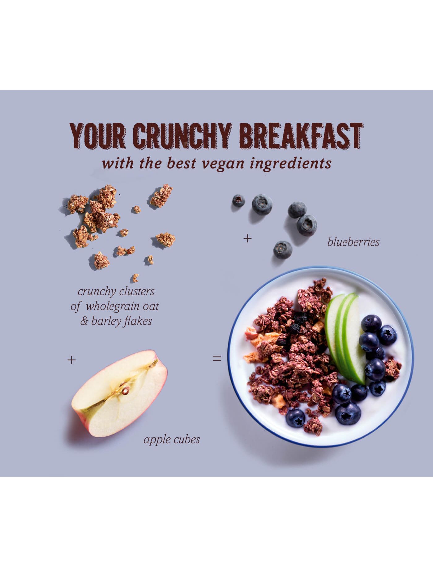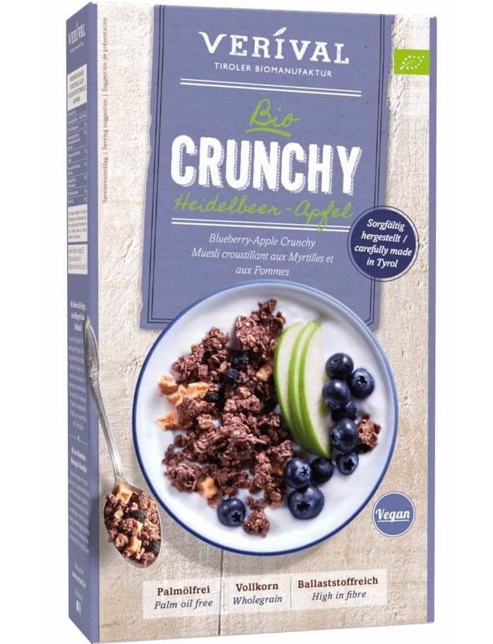 Crunchy є невід’ємною частиною ранкових ритуалів багатьох любителів сніданку. Наш Verival Blueberry-Apple Crunchy повністю обходиться без продуктів тваринного походження та пальмової олії. Хрустка текстура забезпечує потрібну хрусткість, а фрукти надають йому кисло-солодку нотку. Зробіть щось корисне для себе та свого тіла, адже наш Crunchy не лише смачний, але й містить цільнозернові пластівці, багаті клітковиною, вітамінами та мінералами. Непросіяне борошно регулює рівень цукру в крові та довше забезпечує ситість. Тож ненажерливий апетит не має шансів. Крім того, харчові волокна, що містяться в грубому борошні, забезпечують здорове травлення.
