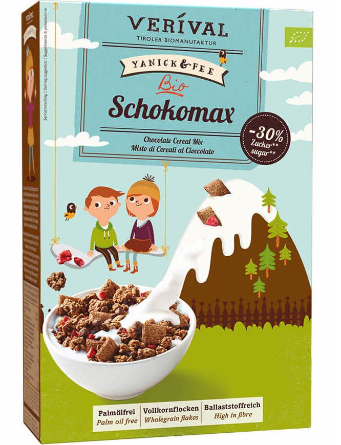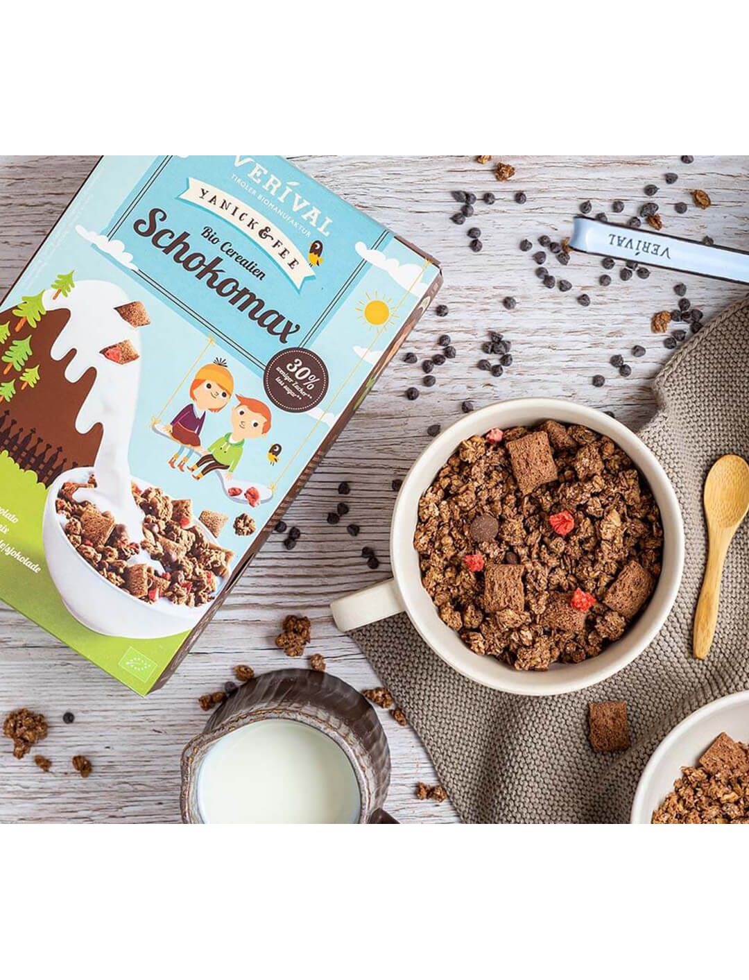 Обережно, дорогі шокоголіки – тут є небезпека залежності! Коли хрусткі хрусткі шоколадні подушечки з шоколадною начинкою та делікатно танучі шоколадні краплі Verival Schokomax, схожі на бісквітне печиво, поєднуються з фруктовими шматочками полуниці, це може означати лише одне: більше немає поганого настрою зранку! Щоб гарантувати, що шоколадні мюслі містять лише необхідну кількість цукру, ми залучили до допомоги експертів з питань харчування та дітей віком 6-10 років для створення рецепту. Для дитячого доброго ранку!