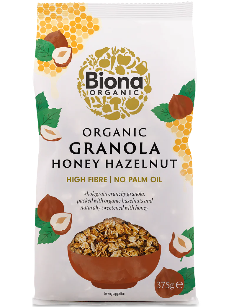 Органічна медова гранола з лісовими горіхами Biona — це золотиста горіхова суміш цільнозернового вівса, лісових горіхів, насіння соняшнику та кунжуту, підсолоджена лише органічним медом і запечена в красивих хрустких гронах, щоб зробити ваш ранок особливим. Не містить пшениці, рафінованого цукру та пальмової олії, ми використовуємо лише найкращі інгредієнти, щоб допомогти вам насолоджуватися тривалим викидом енергії. Смачно подається в мисці зі свіжим холодним горіховим молоком; Органічна гранола Biona також є ідеальною начинкою, щедро подрібненою на нашому кефірі, як основа для оладиків або як проста закуска, коли ви в дорозі! Після відкриття обов’язково зберігайте добре закритим у прохолодному сухому місці, щоб зберегти хрусткість і смак.